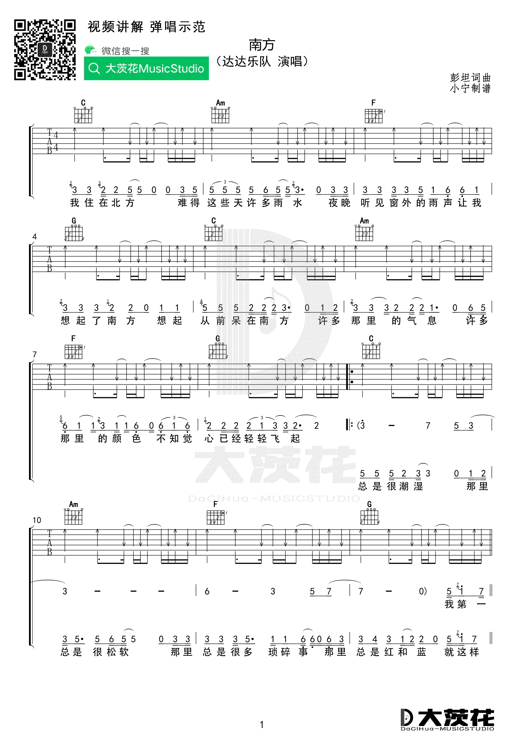 达达乐队《南方》吉他谱六线谱