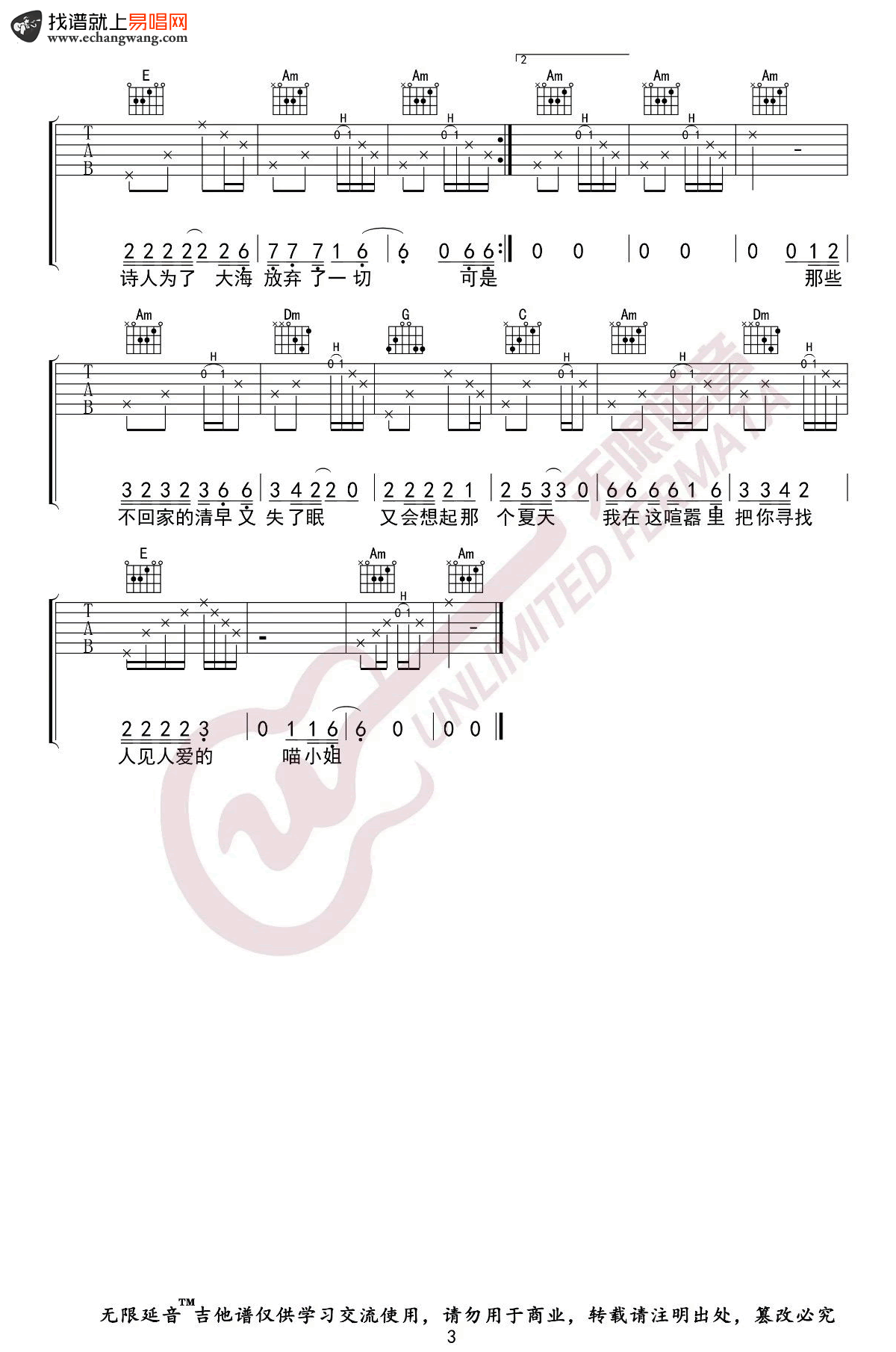 王晓天《再见吧喵小姐》吉他谱C调