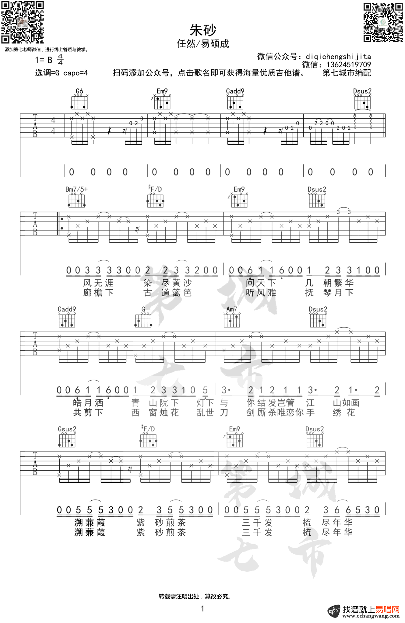 任然《朱砂》吉他谱选调G六线谱
