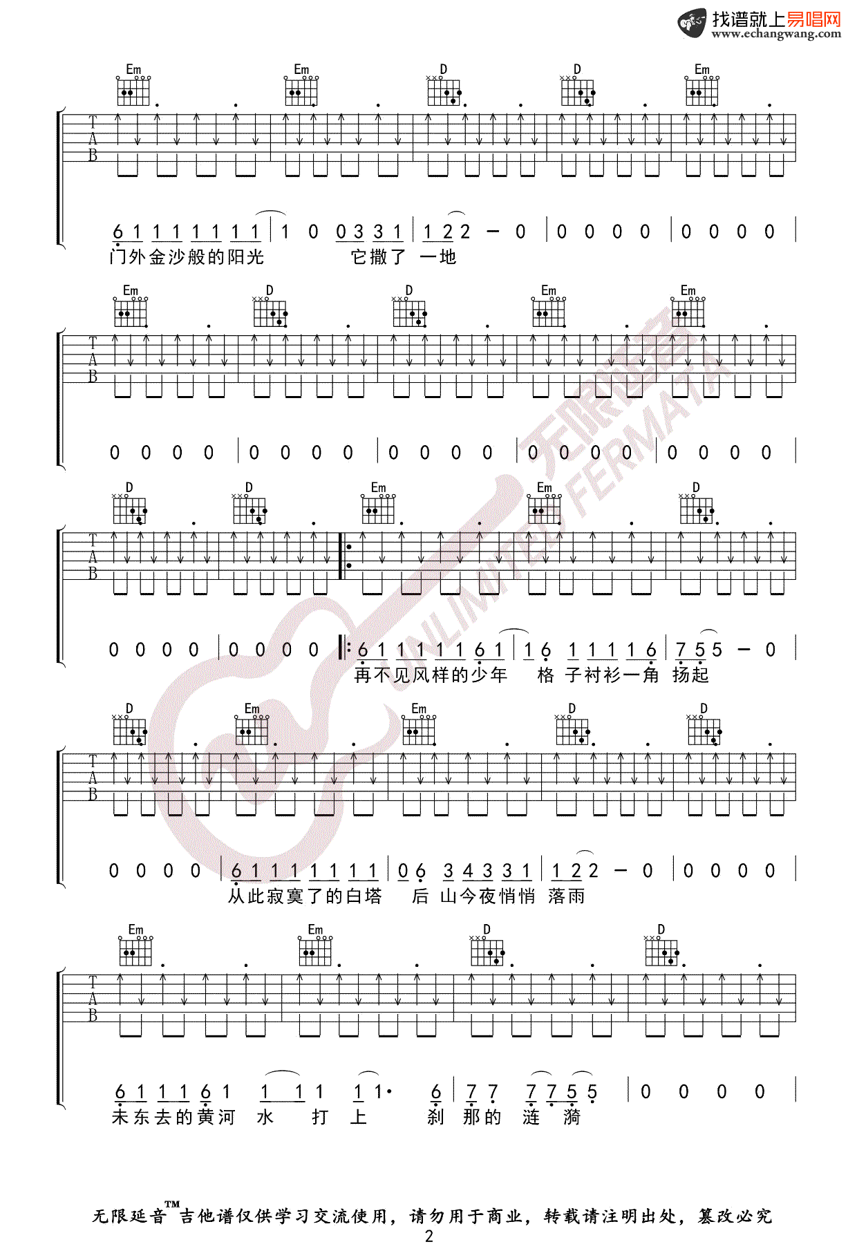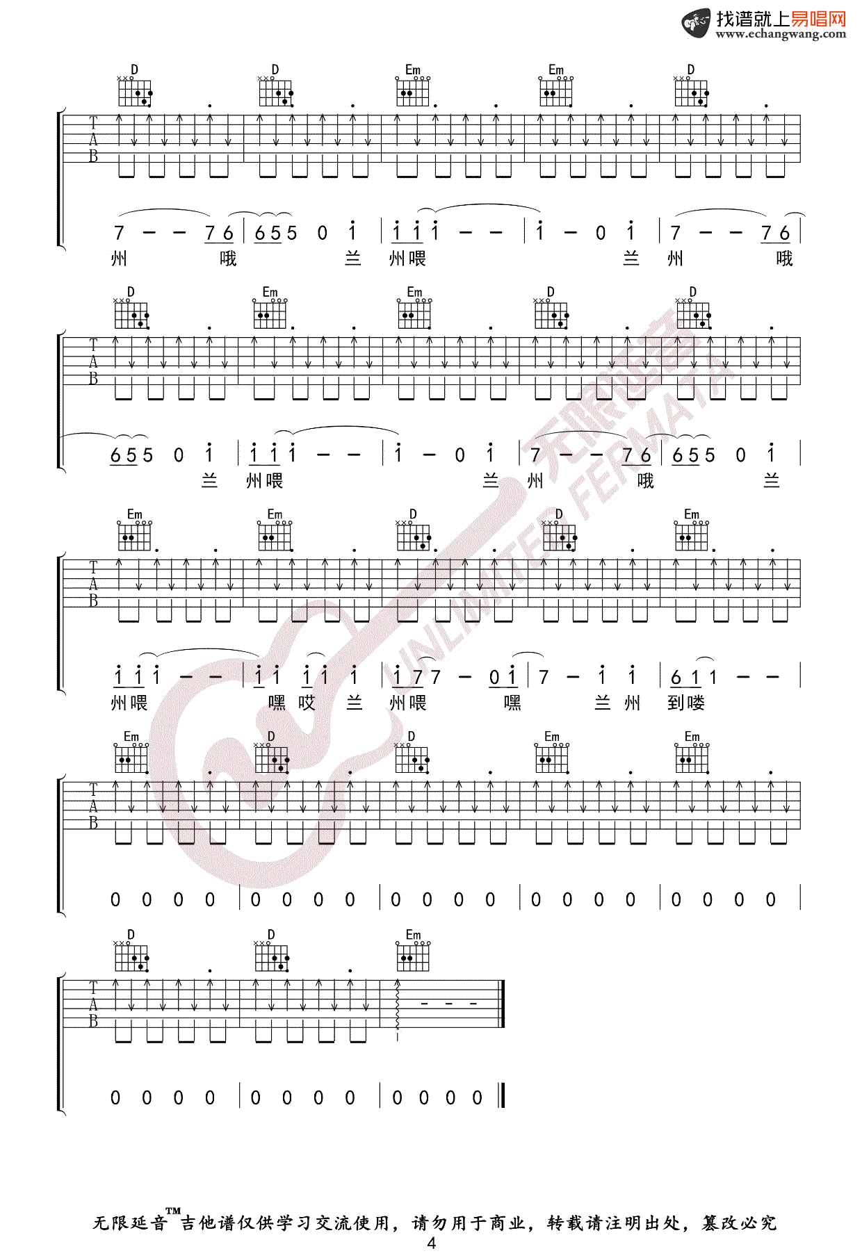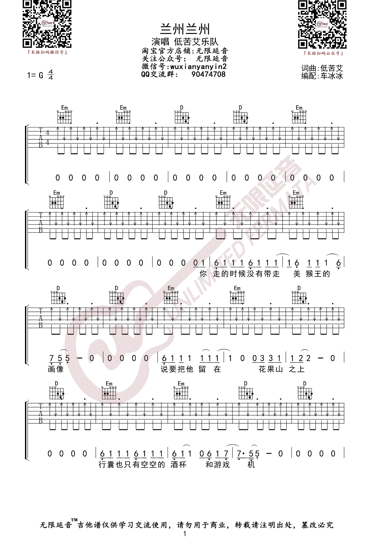 低苦艾乐队《兰州兰州》吉他谱G调六线谱