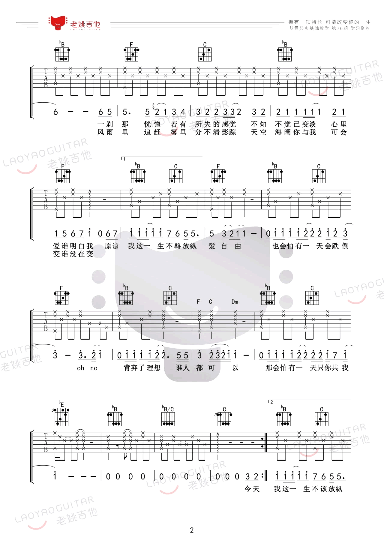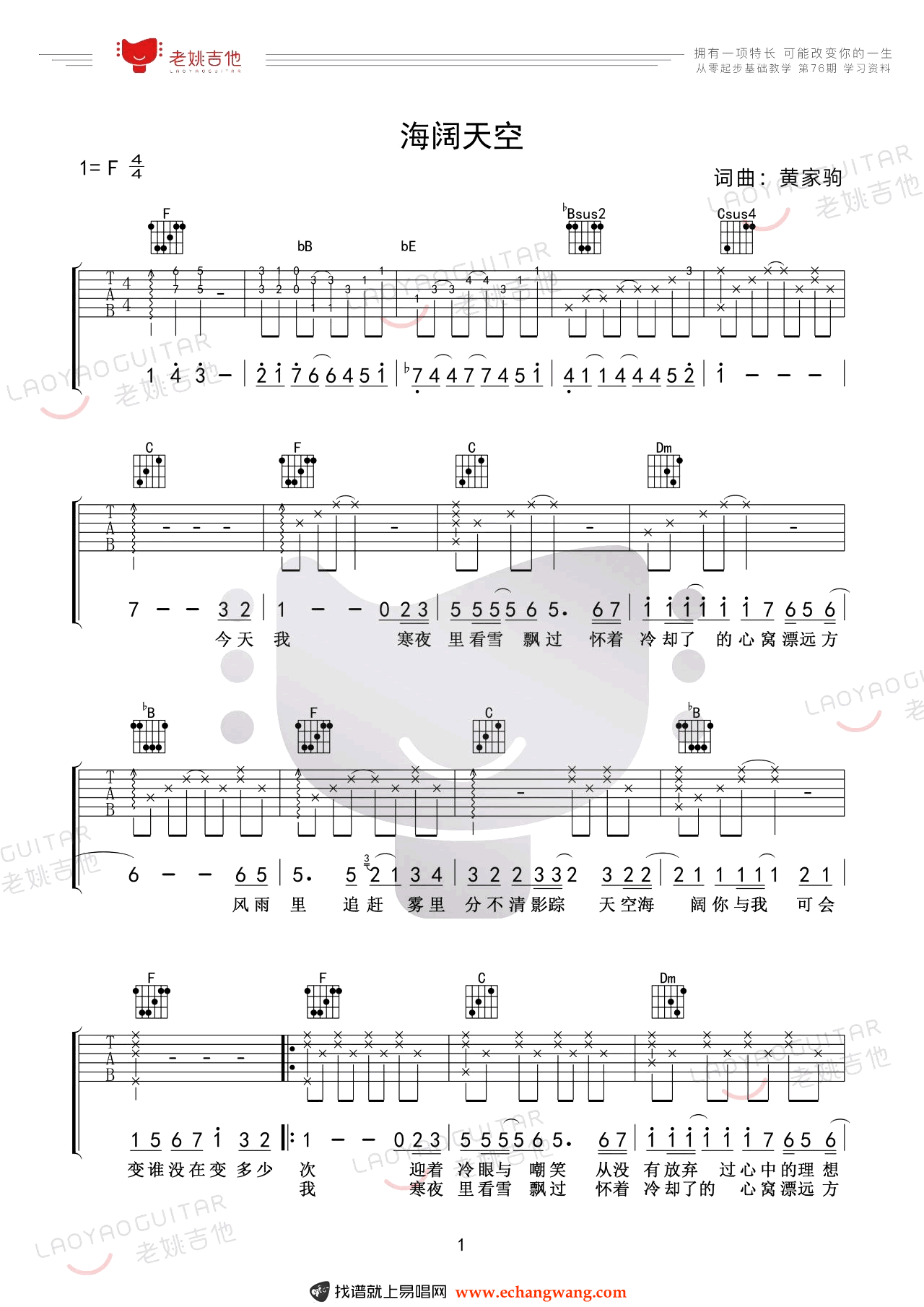 Beyond《海阔天空》吉他谱原调F六线谱