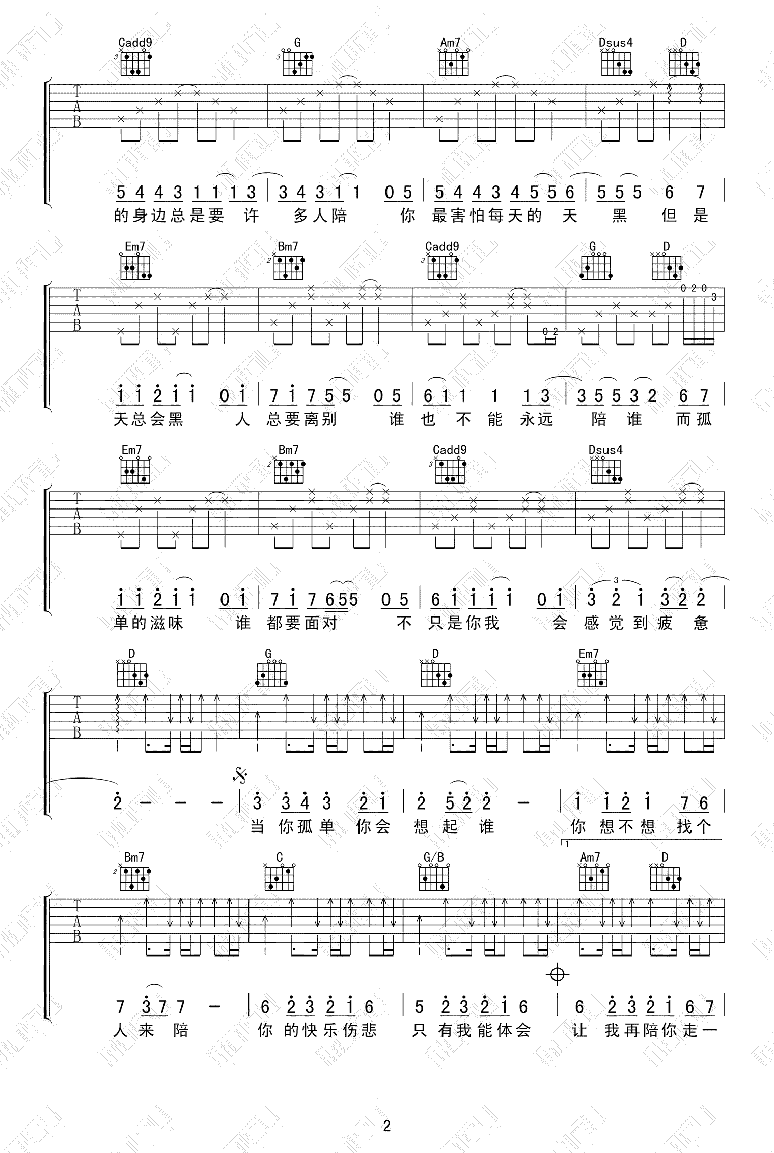 张栋梁《当你孤单你会想起谁》吉他谱选调G六线谱