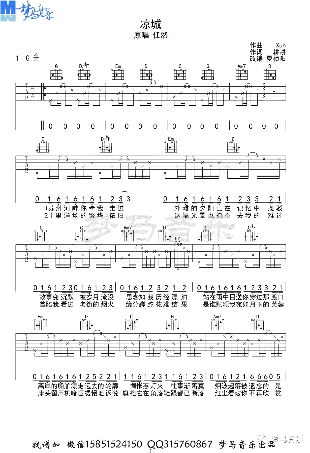 任然《凉城》吉他谱六线谱G调