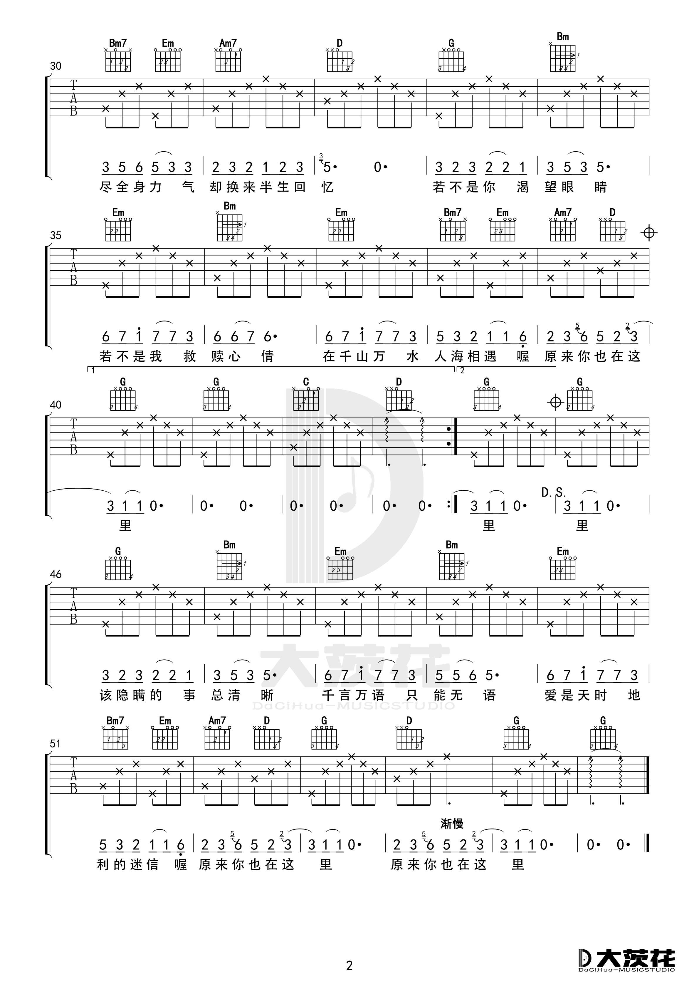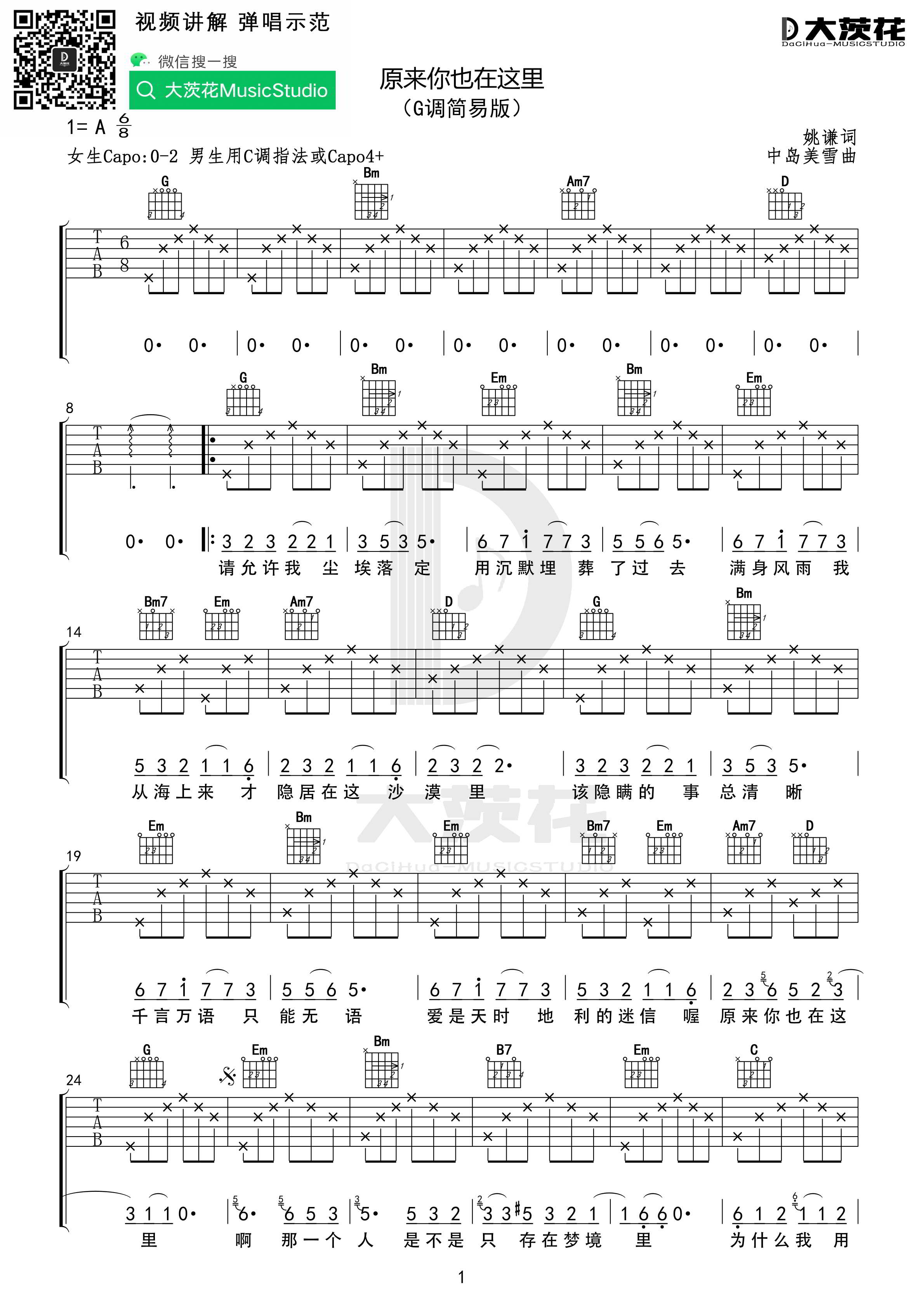 刘若英《原来你也在这里》吉他谱G调简易版