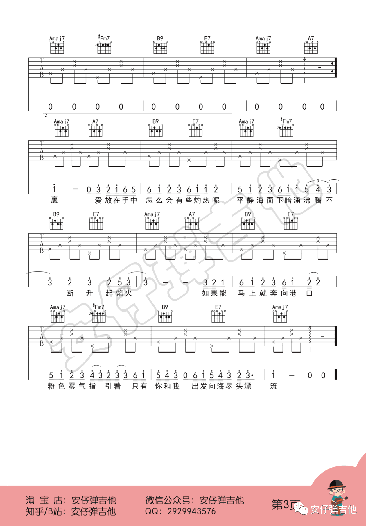 易烊千玺《粉雾海》吉他谱A调六线谱