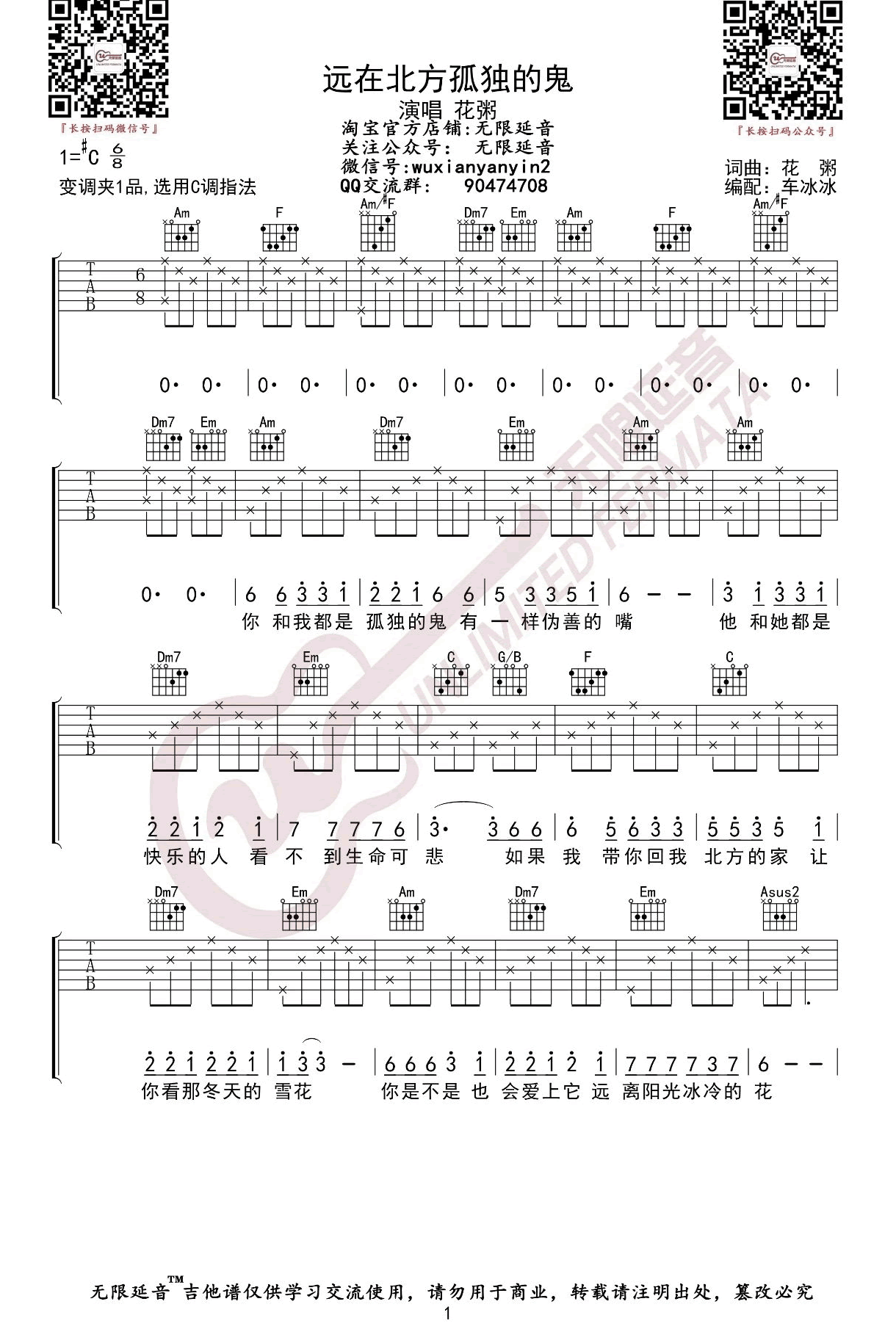 花粥-远在北方孤独的鬼吉他谱C调指法弹唱谱
