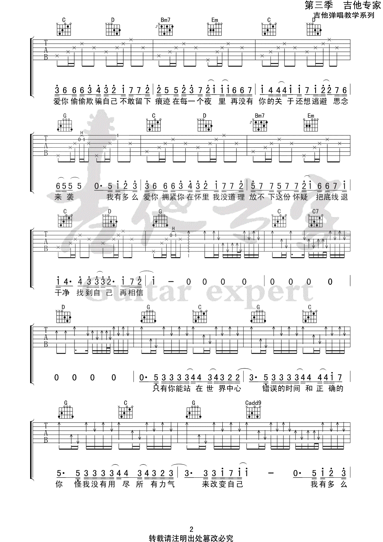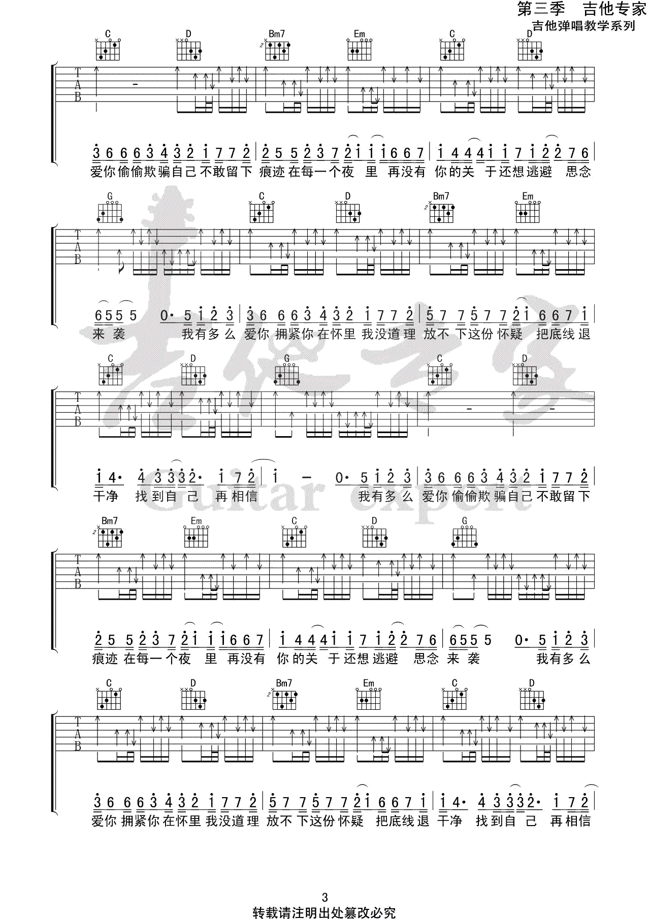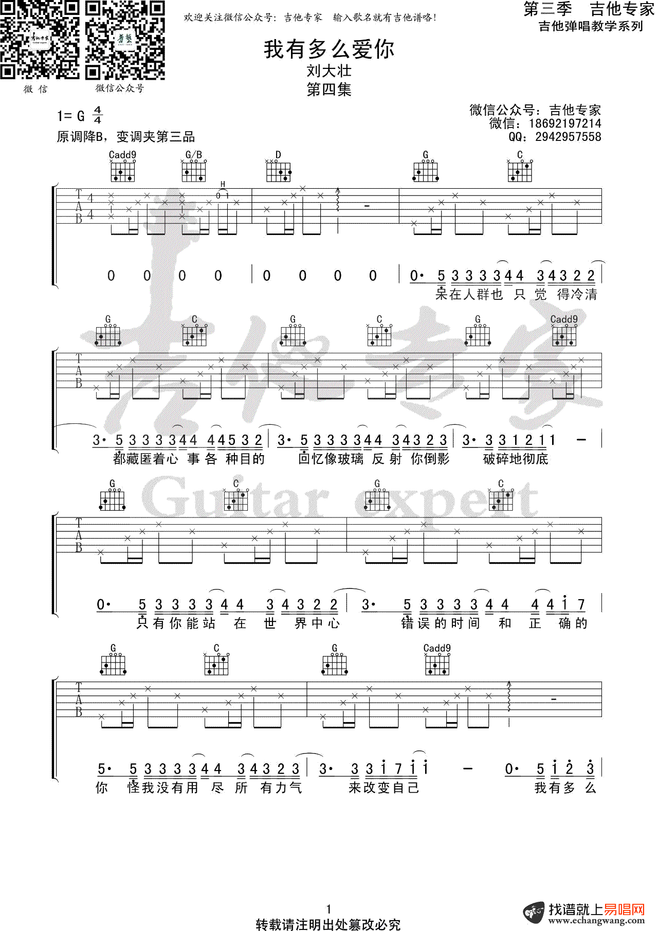 《我有多么爱你》吉他谱,刘大壮演唱,我有多么爱你吉他弹唱谱,歌曲原调降B选用G调指法,变调夹夹第二品。完整版共四张图片六线谱。