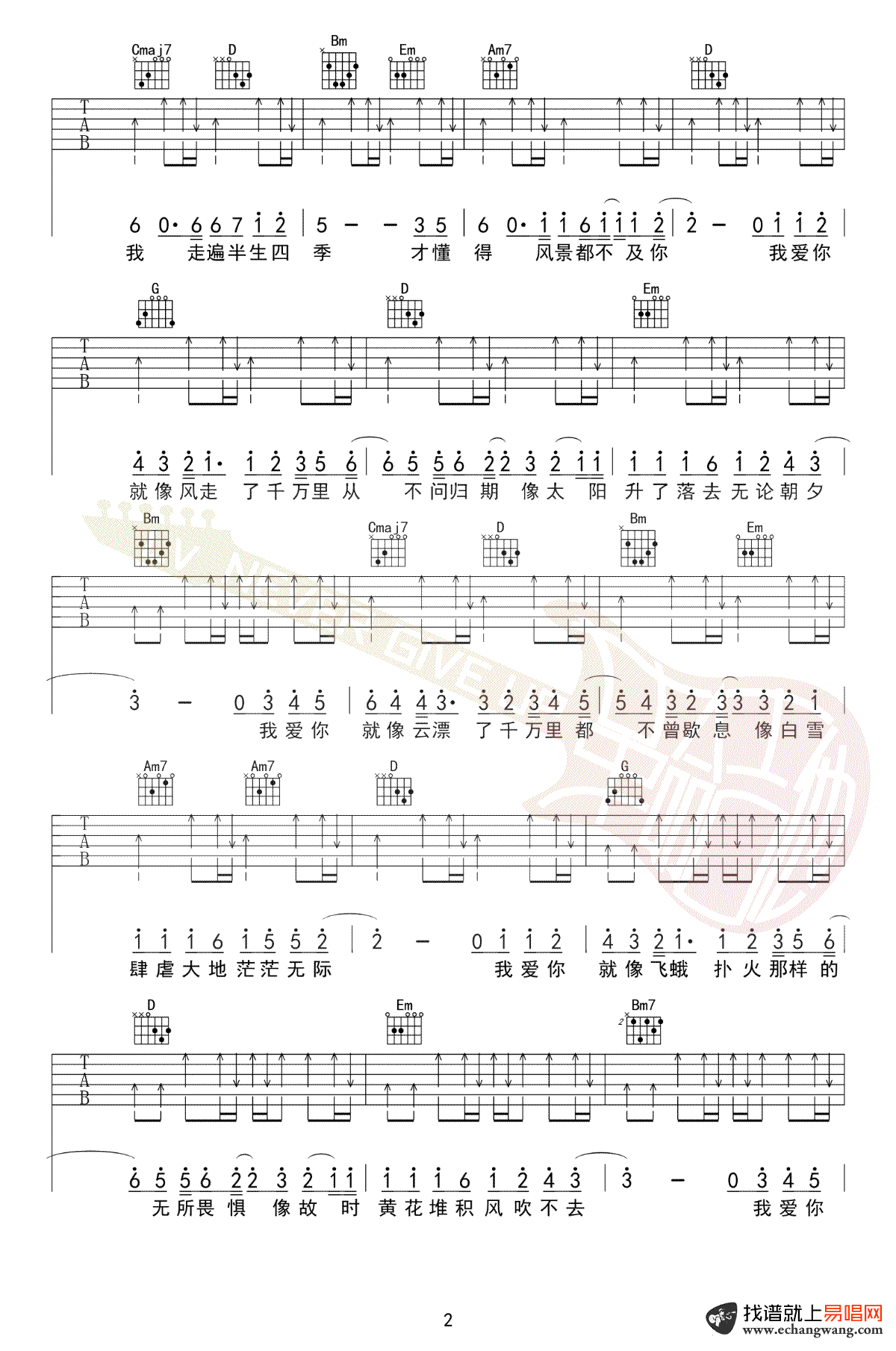 我爱你不问归期吉他谱,白小白的一首网络热门歌曲,我爱你不问归期吉他弹唱谱,选用G调指法,变调夹夹第四品。三张高清图片六线谱,非常好听也很简单的常规四四拍吉他扫弦曲目