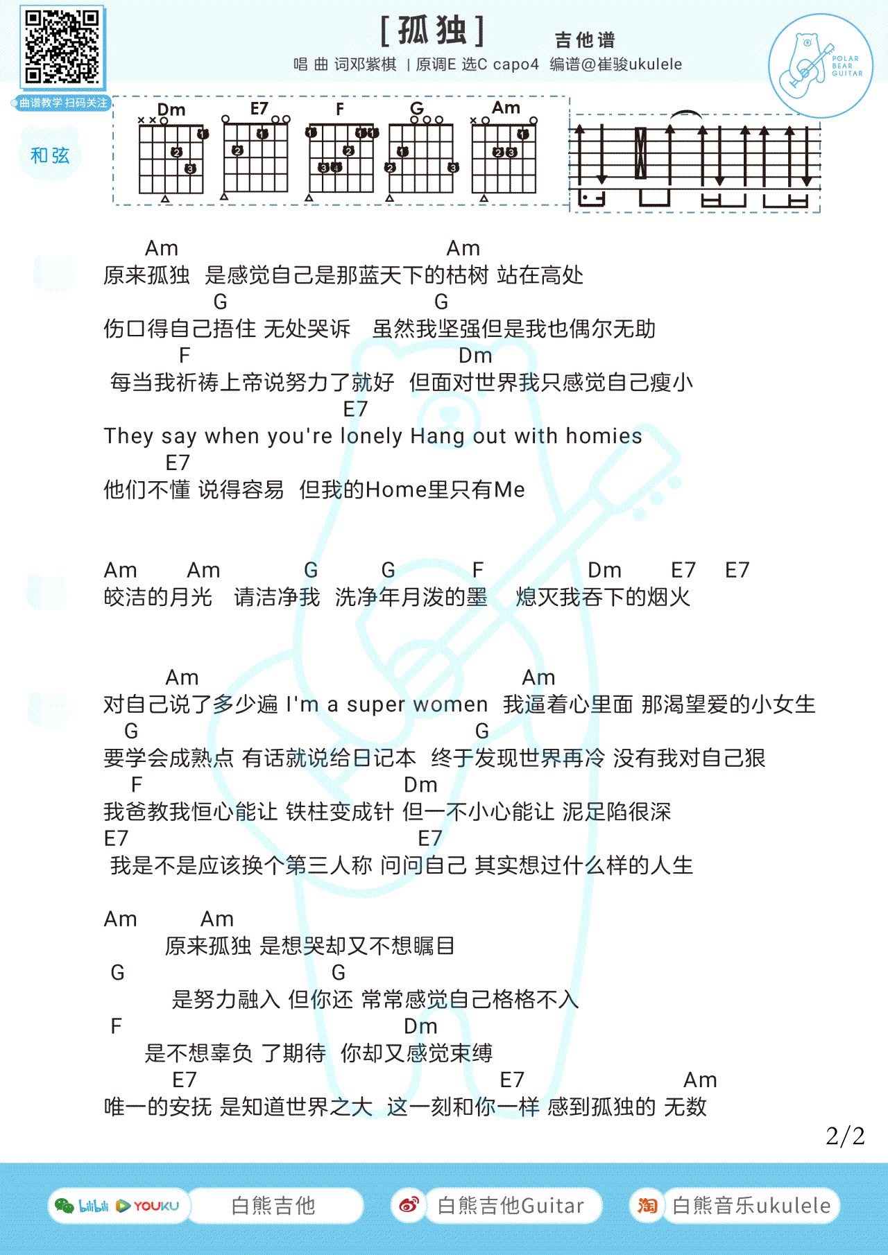 邓紫棋-孤独吉他谱选调C六线谱
