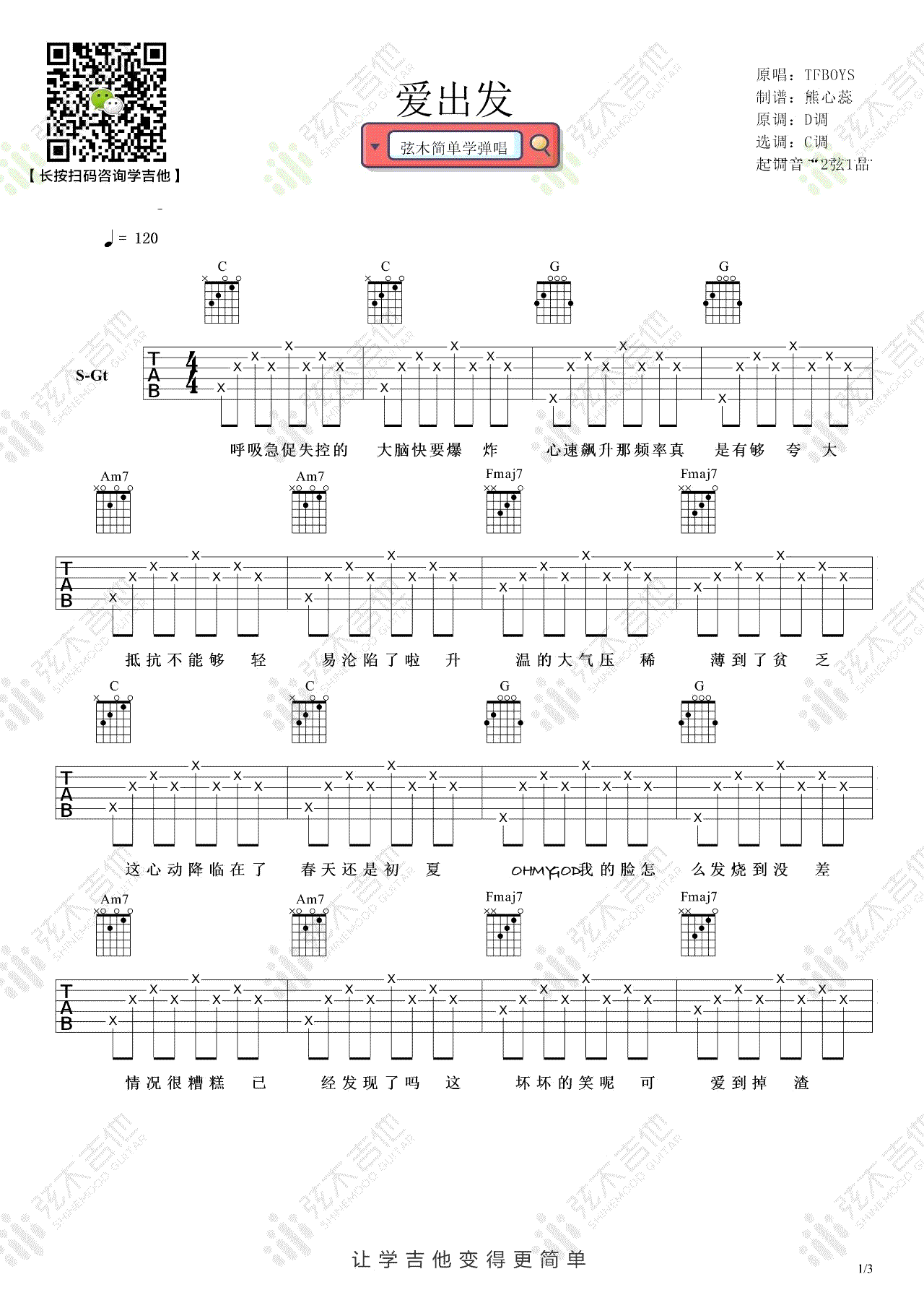 《爱出发》吉他谱,TFBOYS演唱的一首小清新歌曲,爱出发六线谱,原调D选调C,起调音二弦一品,三张弹唱图片谱。