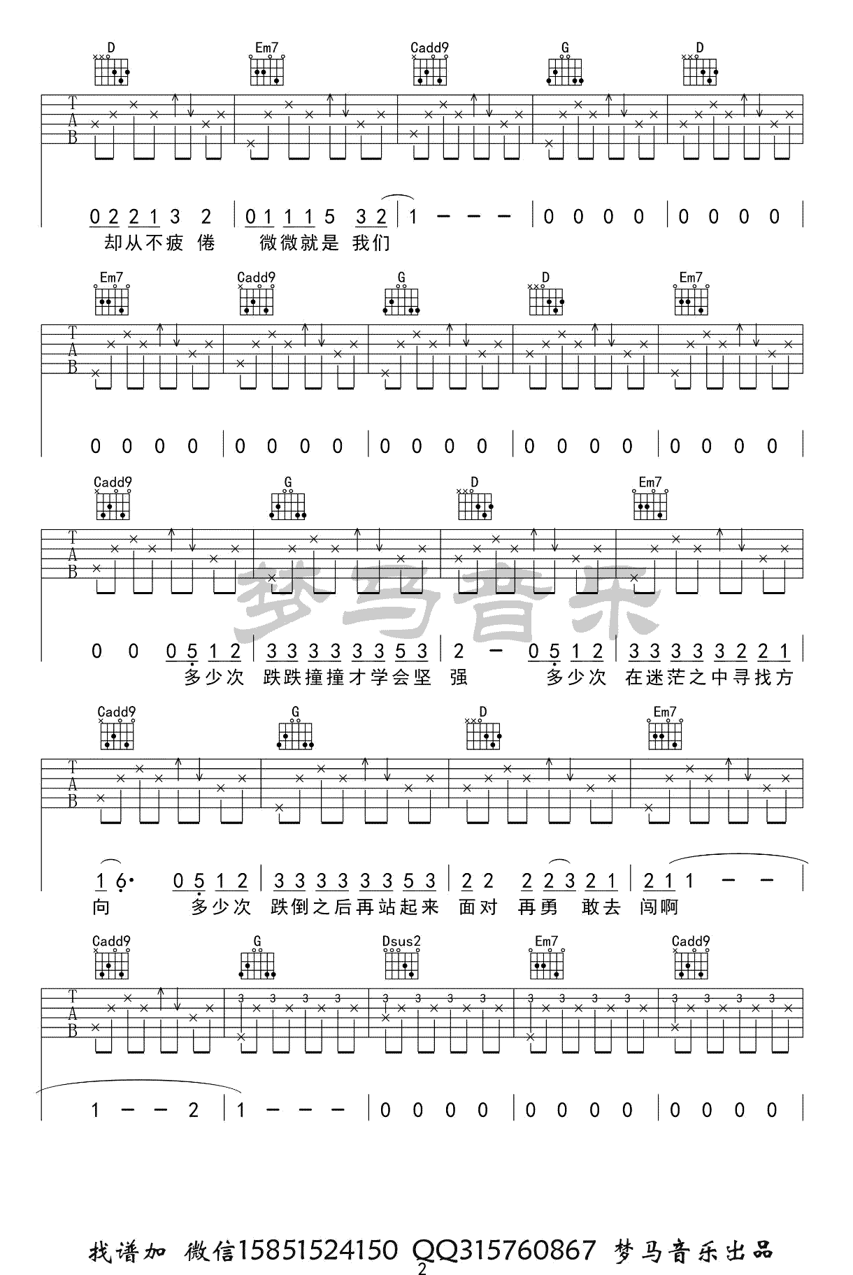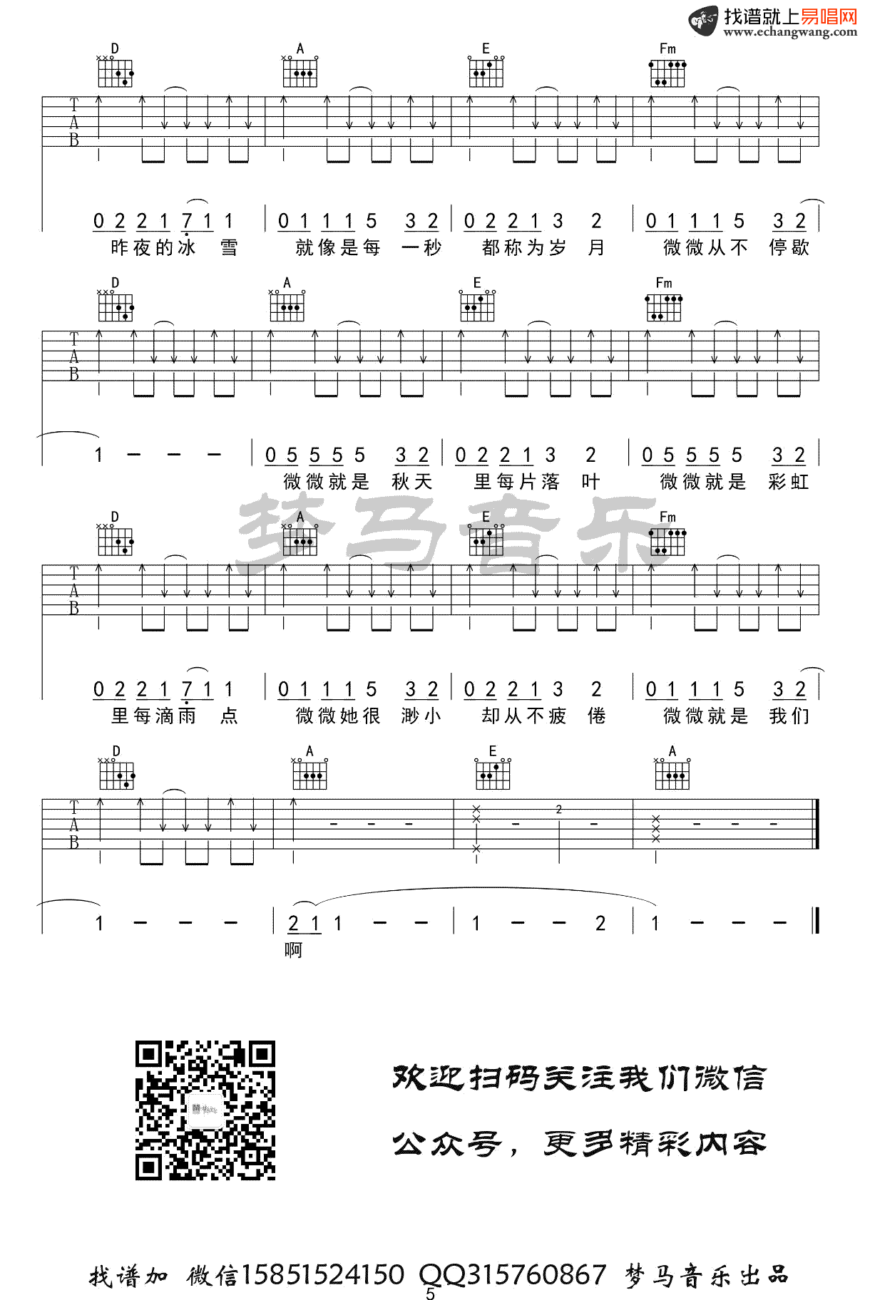 傅如乔《微微》吉他谱,一首抖音上火起来的歌,《青春有你2》节目的暖心单曲。微微吉他弹唱谱,完整版共五张图片六线谱,感谢梦马音乐编配