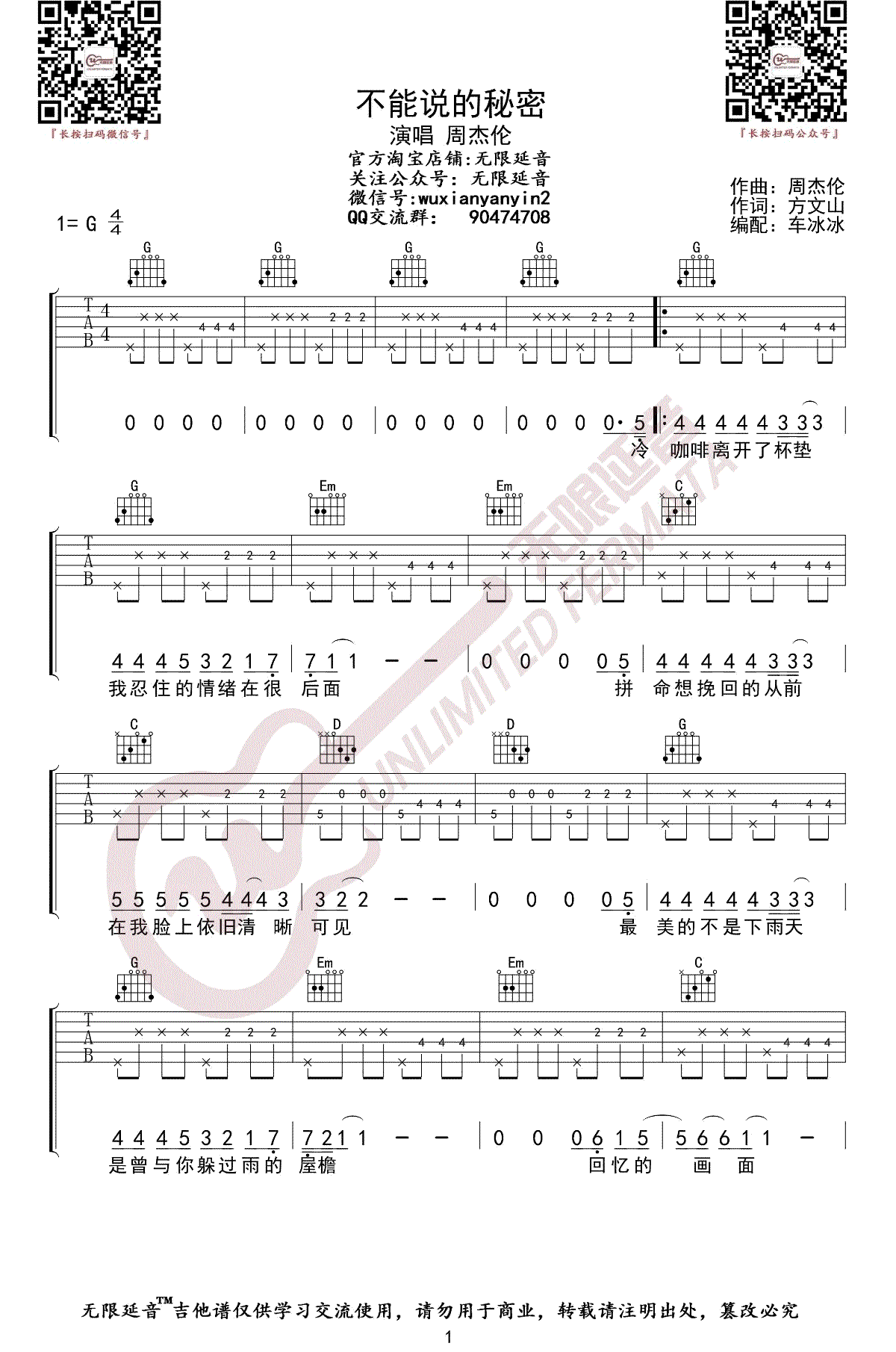 《不能说的秘密》吉他谱,周杰伦早期与桂纶镁主演的一首同名电影主题曲,不能说的秘密六线谱,G调弹唱,三张图片谱。无限延音编配制谱出品。流水般的乐音,将校园里的爱情演绎得如梦如幻,时隔多年熟悉的旋律再次听起,影片场景仿佛历历在目,琴声从教室的窗口飘出来,恍惚间,好像看到一个青涩的少年,伫立在教室外等人下课。