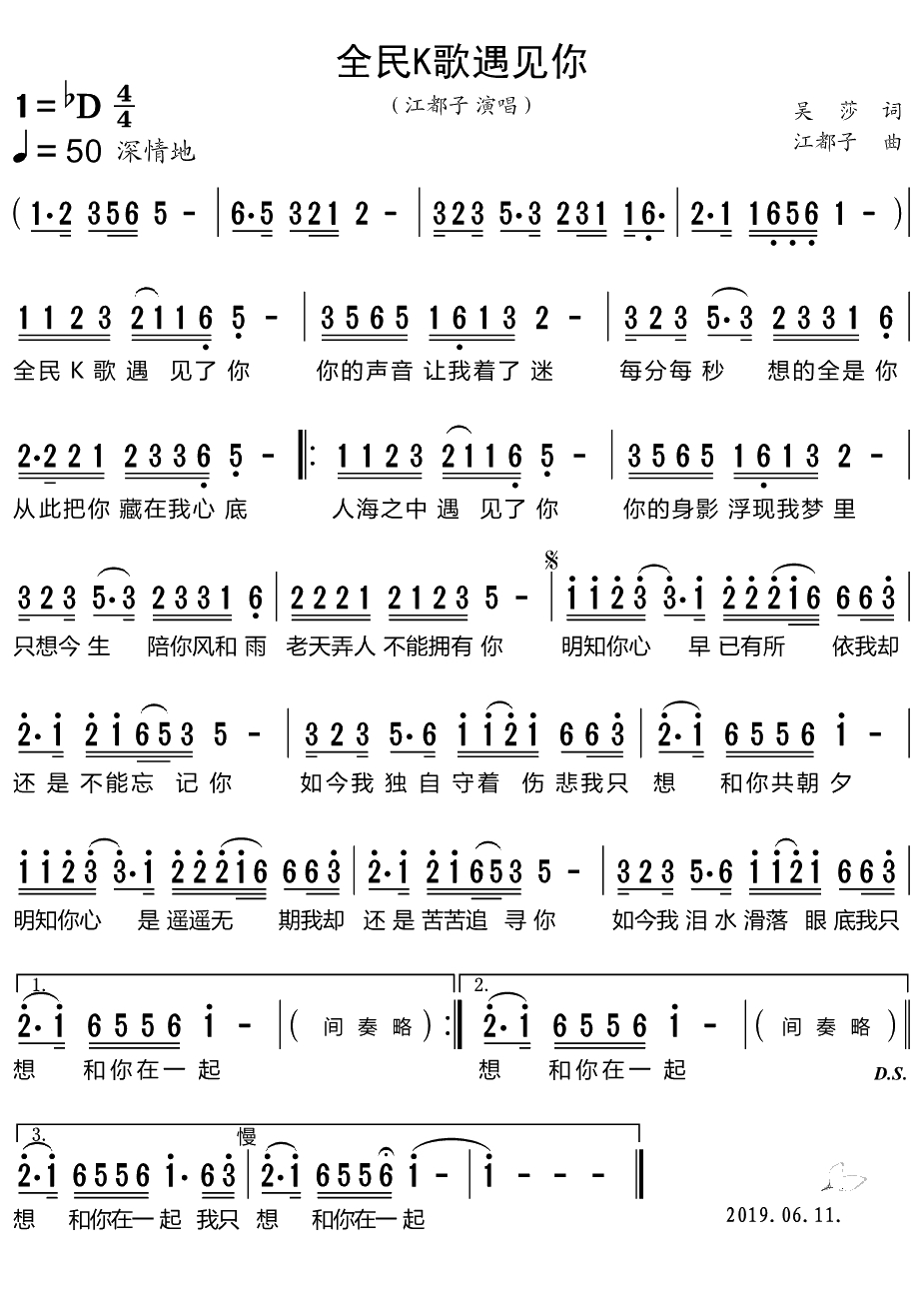 全民K歌遇见你简谱-江都子演唱歌曲-小叶子159曲谱