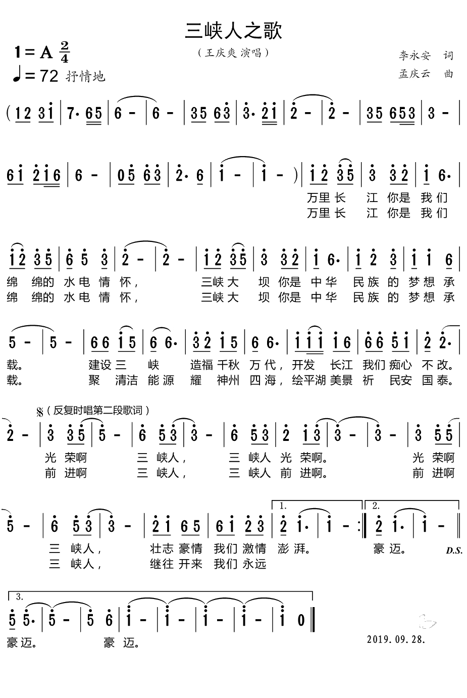 三峡人之歌简谱-王庆爽演唱歌曲-小叶子159曲谱